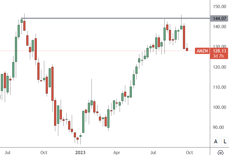 انتعشت أسهم أمازون هذا العام، حيث واجهت مقاومة عند أعلى مستوى لها في الصيف الماضي عند 144 دولارًا. يمكن أن ينخفض السهم أكثر، مع سعر مستهدف محتمل عند 100 دولار.