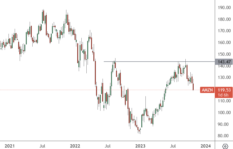واجهت أمازون مقاومة عند مستوى 143 دولارًا وانخفضت منذ ذلك الحين إلى 119.53 دولارًا. إذا كانت الأرباح مخيبة للآمال، فقد يستهدف السهم 100 دولار، مع دعم أكبر عند 80 دولارًا.
